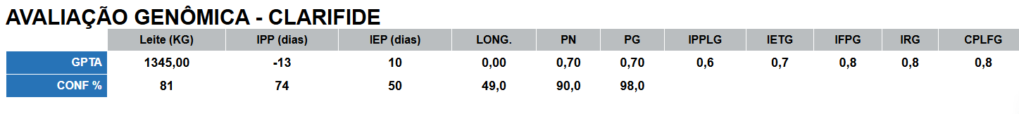 Toro poseedor de prueba genómica con GPTA leche de 1102kg y positivo para precocidad sexual con -30 días para Edad al Primer Parto, fue aprobado en el pre-test y continúa en el test de progenie de la Raza Girolando, ya con hijas e hijos nacidos en la lechería La Nata del Leche, incluso en la primera generación consiguiendo un ternero P.S. con test genómico que superó a sus contemporáneos siendo aprobado para el pre-test de la Raza.